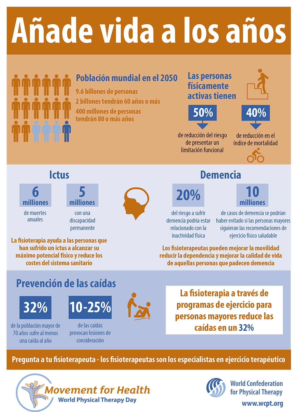 Así mismo, se subraya que la fisioterapia ayuda a las personas que han sufrido un ictus a alcanzar su máximo potencial físico y reduce los costes del sistema sanitario; a las personas con demencia a mejoranrsu movilidad y reducir su dependencia, y a las perosas mayores a reducir las caídas en un 32% a través de programas de ejercicio.