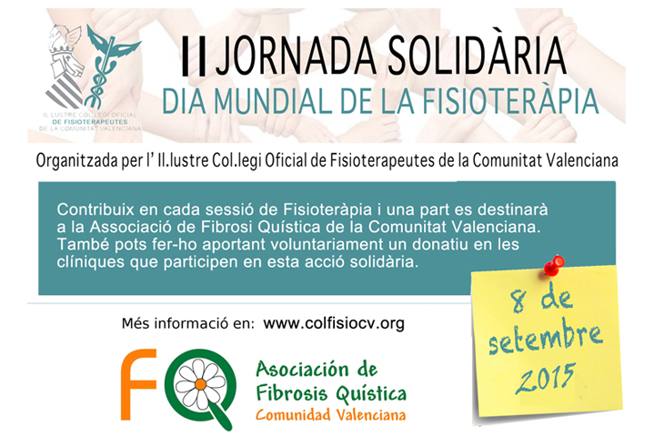 Con motivo del Día Mundial de la Fisioterapia, que tendrá lugar el 8 de septiembre, el Colegio de Fisioterapeutas de la Comunidad Valenciana va a organizar la II Jornada Solidaria. En esta ocasión, la entidad beneficiaria escogida es la Asociación de Fibrosis Quística de la Comunidad Valenciana.