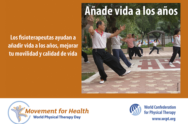 Con motivo del Día Mundial de la Fisioterapia, que se celebra hoy 8 de septiembre, el Colegio de Fisioterapeutas de la Comunidad Valenciana se suma a la campaña de la World Confederation for Physical Therapy (WCPT) que en esta edición, bajo el lema "Añade vida a los años", se ha focalizado en dar a conocer cómo el fisioterapeuta ayuda a mejorar la movilidad y la calidad de vida, invitando a todas aquellas personas que tengan problemas de movilidad, a consutar con su fisioterapeuta, el especialista en ejercicio terapéutico.