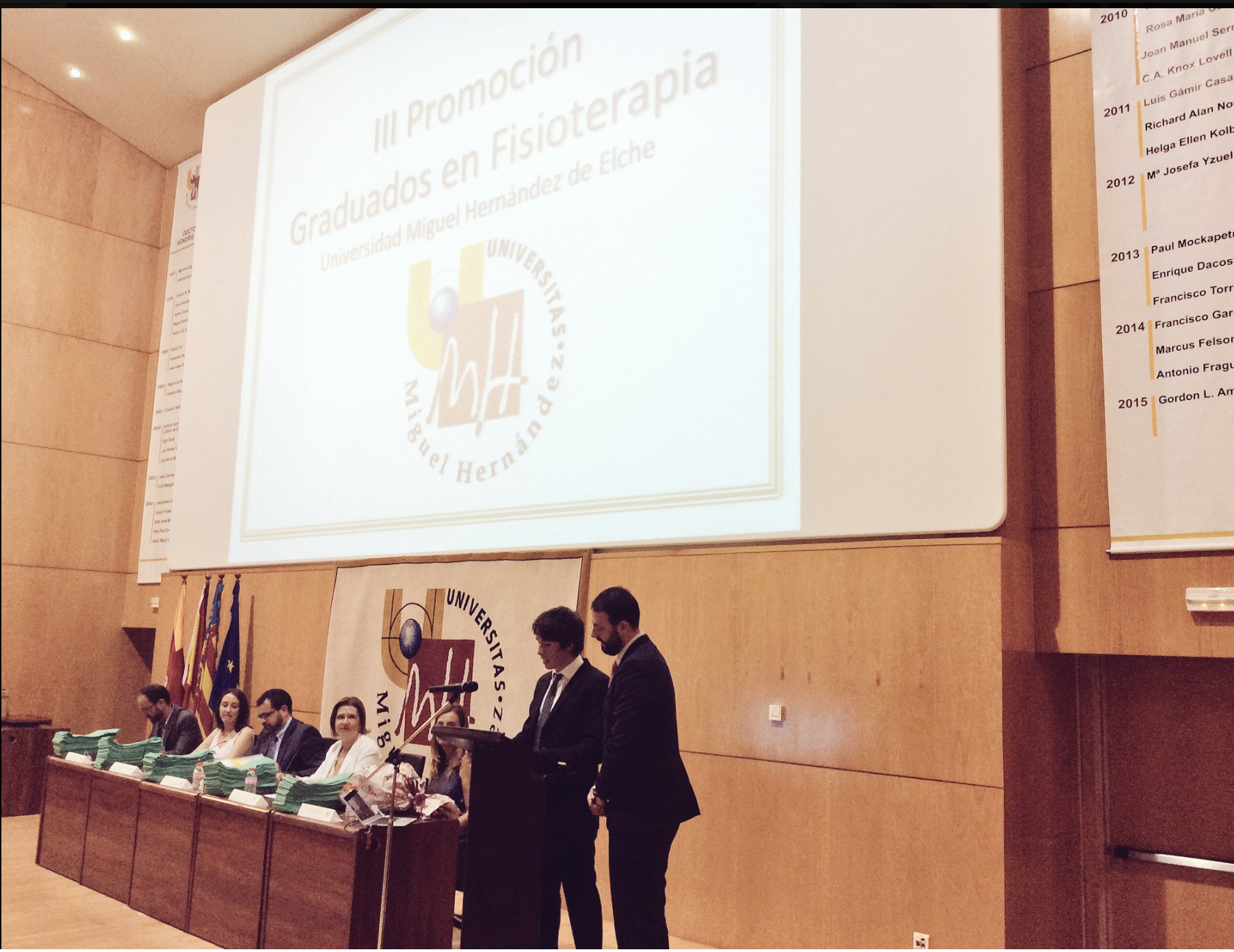 El estudiante de Fisioterapia de la UMH, José Néstor Jiménez Campfens, y el delegado de la titulación, Enrique Herrero Castellanos, han intervenido en representación de los estudiantes de esta tercera promoción.